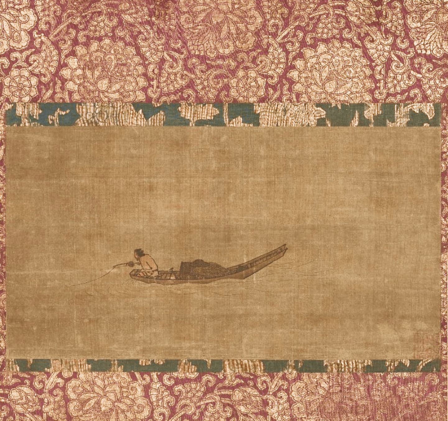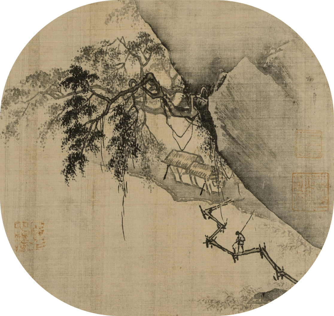 Similar to other Southern Song landscapes, this painting draws on minimalist flourishes and the use of liubai to depict fog, making the cliffs above appear even taller and further away. The painting’s protagonist ruminates on the epic scene before him, seemingly suggesting he sees the illusory nature of the world.