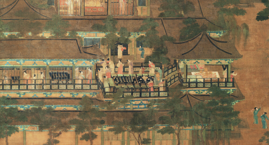 In the finely detailed jiehua (ruled line) architectural painting Palace Banquet (Time to Pray for Ingenuity), the women are shown to be taking part in revelry in the imperial courtyard during Qi Qiao, a traditional festival during which women pray for ingenuity and handicraft skills. Harmonious union is the key theme here, and we see women threading needles and going about their business in the wider composition of palace life.